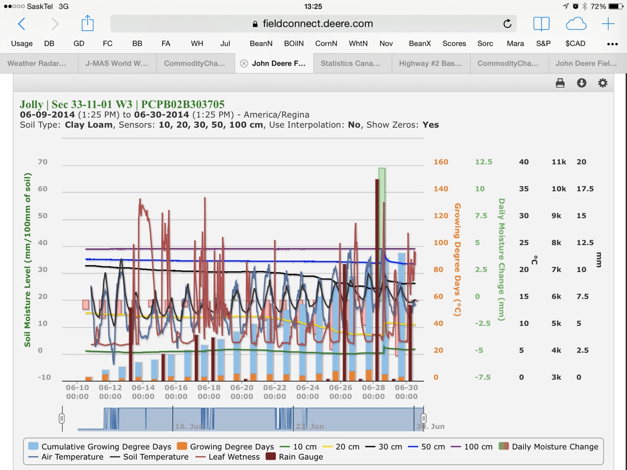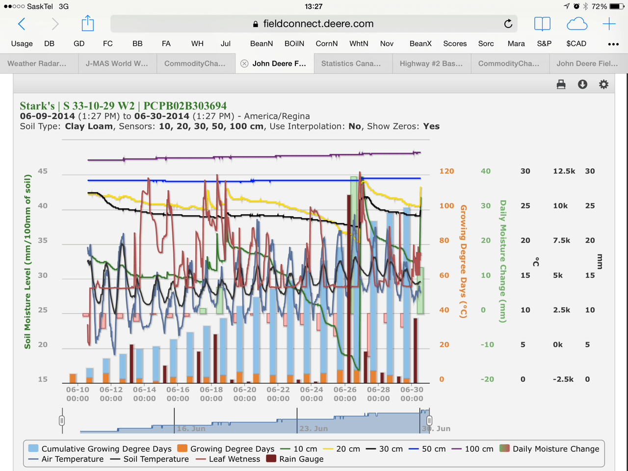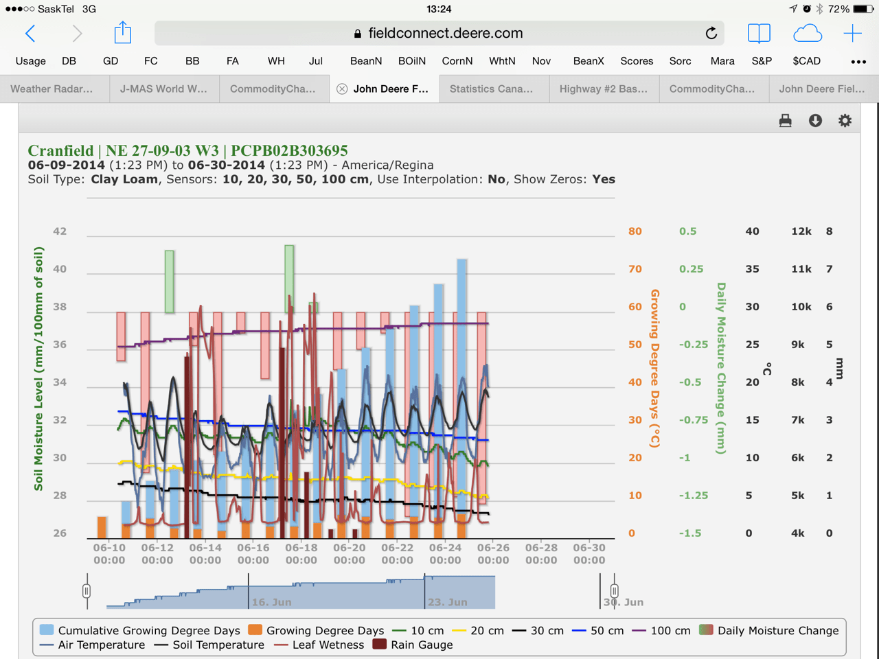 Kincaid North Station has been running relatively smoothly, though has still not come down from “full point” (noted as Blue on location map) where it was put artificially via the dirt/water solution used to ensure probe contact with soil at start-up. Readings are behaving normal. Kincaid north possibly had 2 consecutive dry days, which was the most of any station but still below what could nullify Sclerotinia and this event happened prior to bolting anyhow. Readings going into July should be normal and should prove very useful in assessing Sclerotinia, Fusarium, Cereal Leaf Disease, Midge and Drydown application needs going forward.
